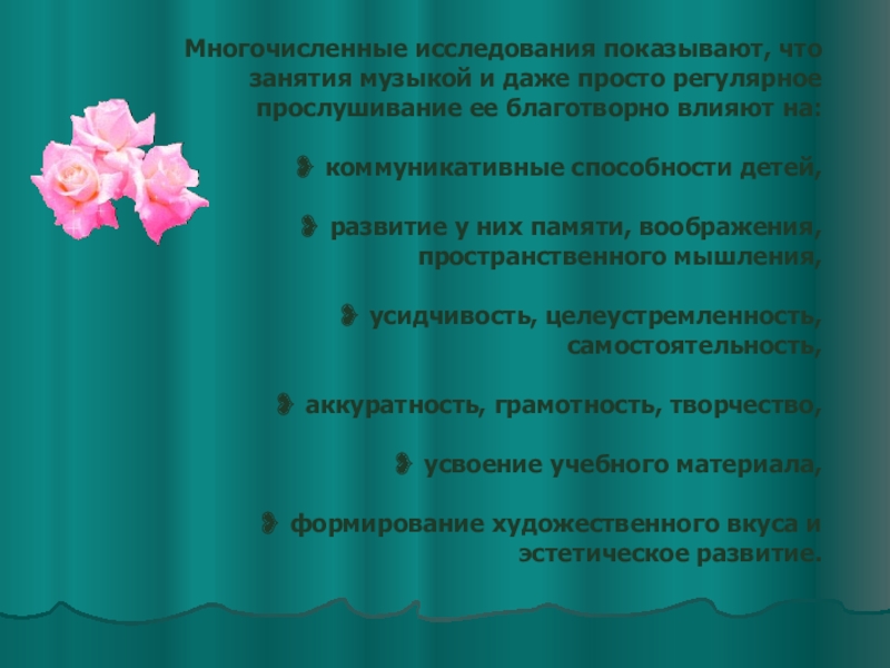 Слайд 14Многочисленные исследования показывают, что занятия музыкой и даже просто регулярное прослушивание