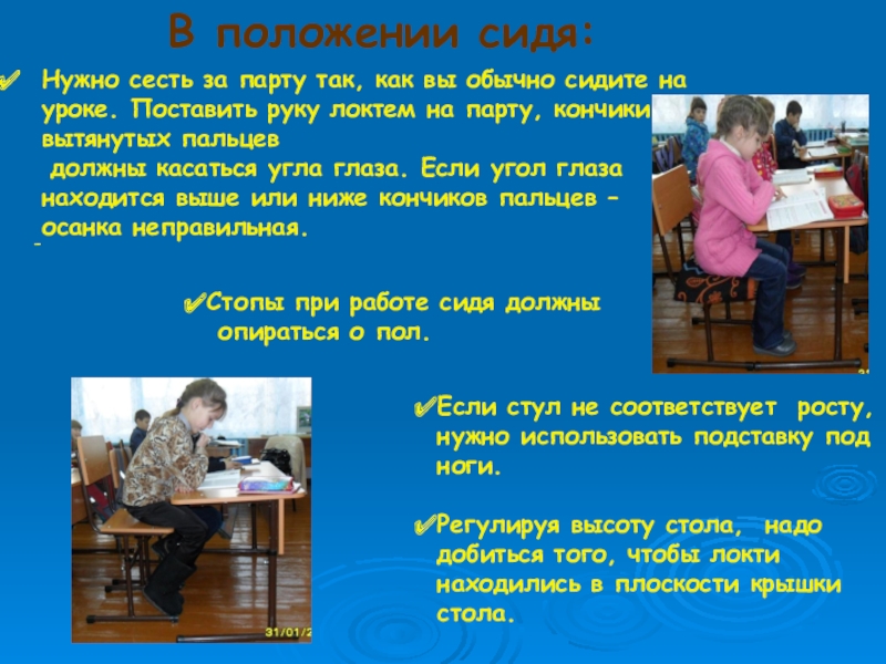 Нужно сесть за парту так, как вы обычно сидите на уроке. Поставить руку локтем на парту, кончики вытянутых пальцев