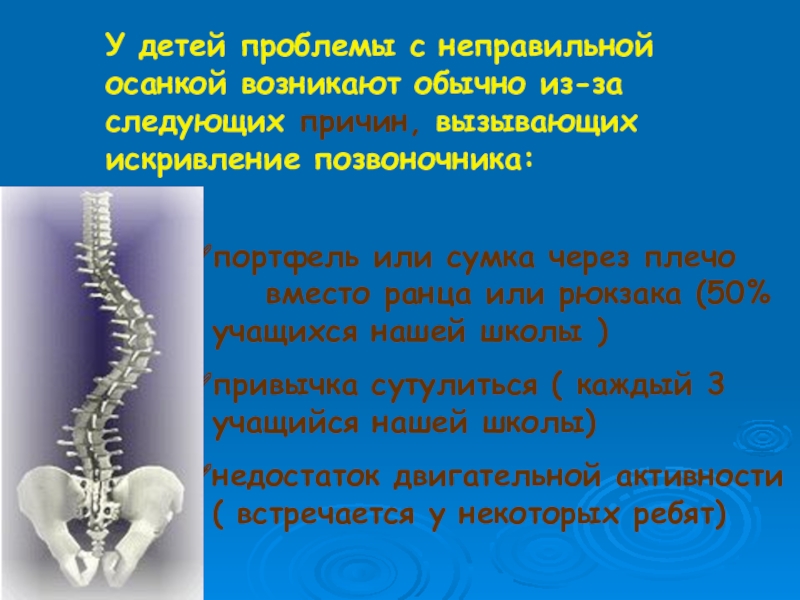 У детей проблемы с неправильной осанкой возникают обычно из-за следующих причин, вызывающих искривление позвоночника: