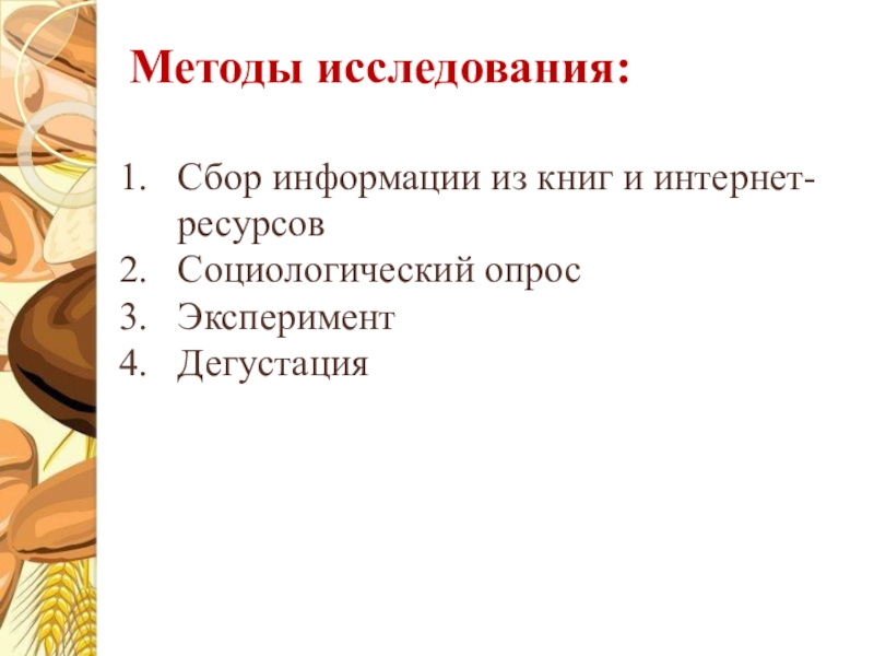Методы исследования:Сбор информации из книг и интернет-ресурсовСоциологический опросЭкспериментДегустация