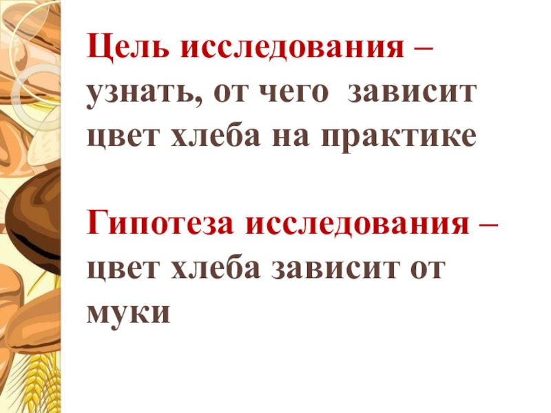Слайд 2Цель исследования – узнать, от чего зависит цвет хлеба на практике