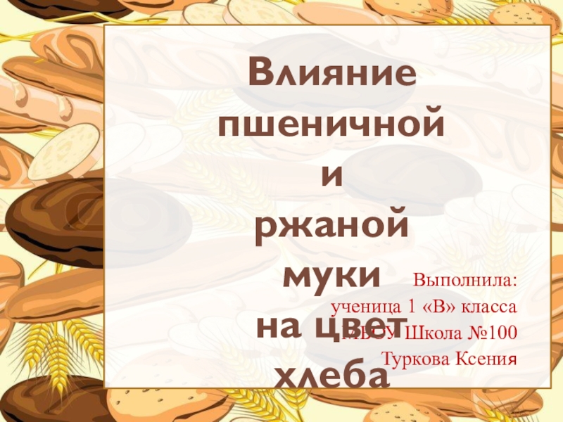 Выполнила: ученица 1 «В» класса МБОУ Школа №100Туркова КсенияВлияние пшеничной и ржаной муки на цвет хлеба