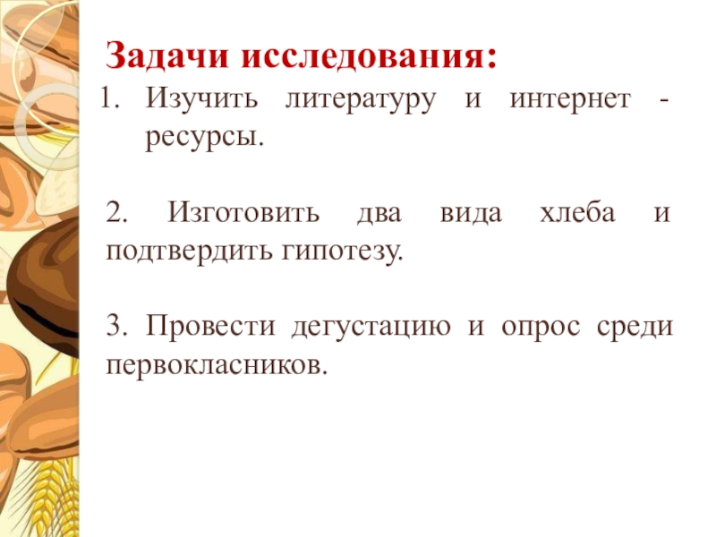 Задачи исследования:Изучить литературу и интернет - ресурсы.2. Изготовить два вида хлеба и подтвердить гипотезу.3. Провести дегустацию и
