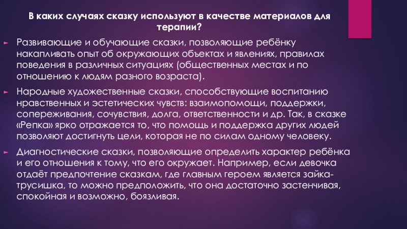 Слайд 5В каких случаях сказку используют в качестве материалов для терапии?