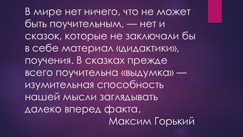 и сказок, которые не заключали бы в себе материал «дидактики», поучения. В сказках прежде всего поучительна «выдумка» — изумительная способность нашей мысли заглядывать далеко вперед факта.