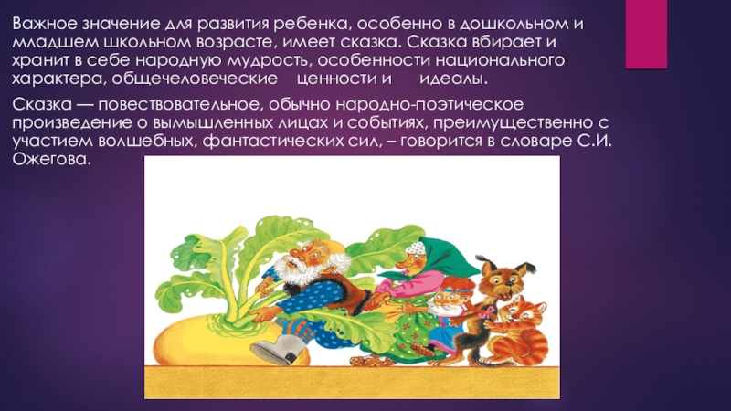 возрасте, имеет сказка. Сказка вбирает и хранит в себе народную мудрость, особенности национального характера, общечеловеческие ценности и идеалы.