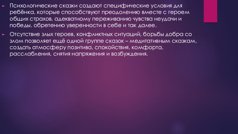 Слайд 6Психологические сказки создают специфические условия для ребёнка, которые способствуют преодолению вместе