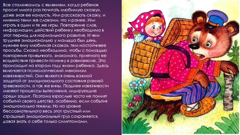 сказку», даже зная ее наизусть. Или рассказать сказку, и именно теми же словами, что и ранее. Или играть в одни и те же игры. Повторение слов, информации, действий ребенку необходимо в этот период для нормального развития. И чем труднее эмоционально у малыша был день, нужнее ему «любимая сказка», тем настойчивее просьбы. Сказка необходима, чтобы с помощью повторения привычного, знакомого, приятного ее воздействия привести психику в равновесие, Это происходит на втором году жизни ребенка. Здесь включается психологический механизм навязчивостей. Они являются очень важной защитой от эмоционального состояния ранней тревожности, а так же вины. Позднее навязчивости меняют процессы вытеснения, лидирующие среди защит. Поэтому взрослые часто не помнят событий своего детства, особенно, если события эмоционально тяжелы. Но на уровне бессознательного весь этот грустный или страшный эмоциональный груз сохраняется, давая знать о себе только симптомами.