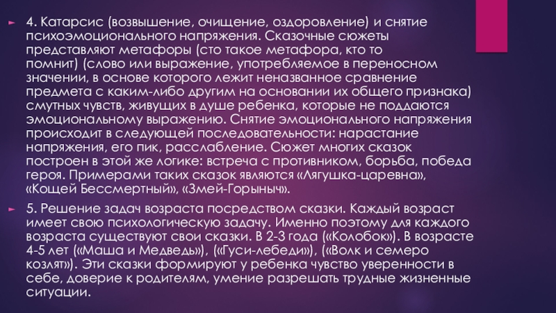 Слайд 104. Катарсис (возвышение, очищение, оздоровление) и снятие психоэмоционального напряжения. Сказочные сюжеты представляют метафоры (сто такое метафора,