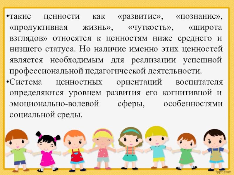 Система ценностных ориентаций воспитателя определяются уровнем развития его когнитивной и эмоционально-волевой сферы, особенностями социальной среды.
