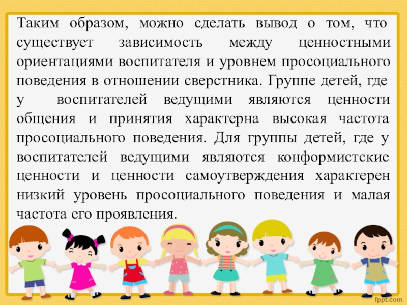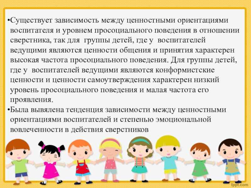 Слайд 29Существует зависимость между ценностными ориентациями воспитателя и уровнем просоциального поведения в
