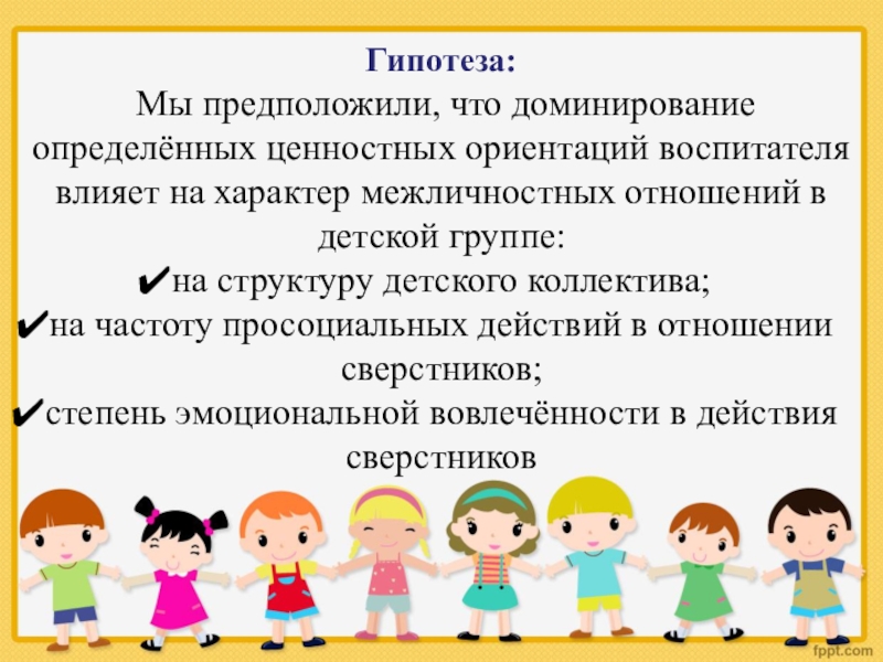 Предмет исследования: зависимость между ценностными ориентациями воспитателя и особенностями межличностных отношений детей в группе ДОУ