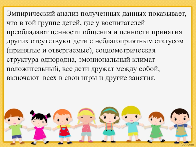 у воспитателей преобладают ценности общения и ценности принятия других отсутствуют дети с неблагоприятным статусом (принятые и отвергаемые), социометрическая структура однородна, эмоциональный климат положительный, все дети дружат между собой, включают всех в свои игры и другие занятия.