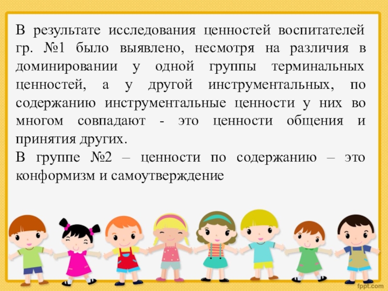 Слайд 21Во второй группе детей, у воспитателей которых ведущими ценностями являются ценности