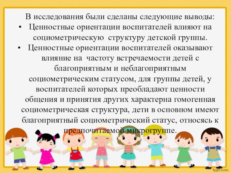 Ценностные ориентации воспитателей оказывают влияние на частоту встречаемости детей с благоприятным и неблагоприятным социометрическим статусом, для группы детей, у воспитателей которых преобладают ценности общения и принятия других характерна гомогенная социометрическая структура, дети в основном имеют благоприятный социометрический статус, относясь к предпочитаемой микрогруппе.