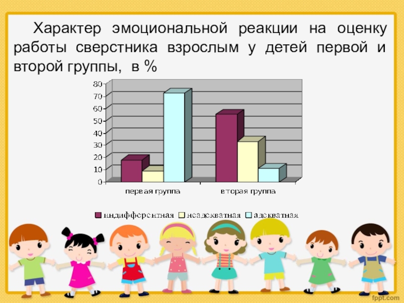 Слайд 24Характер эмоциональной реакции на оценку работы сверстника взрослым у детей первой