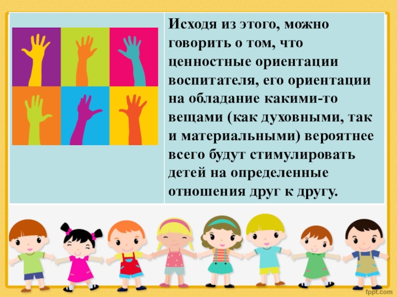 Исходя из этого, можно говорить о том, что ценностные ориентации воспитателя, его ориентации на обладание какими-то вещами (как духовными, так и материальными) вероятнее всего будут стимулировать детей на определенные отношения друг к другу.