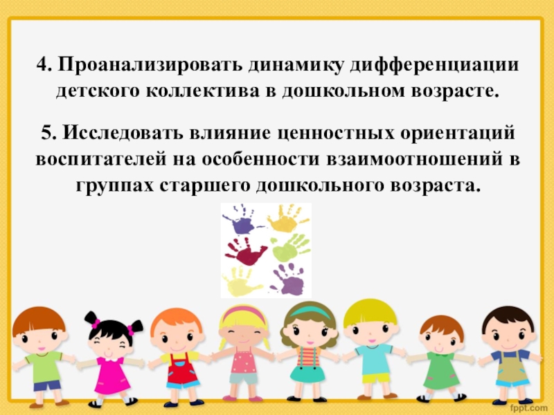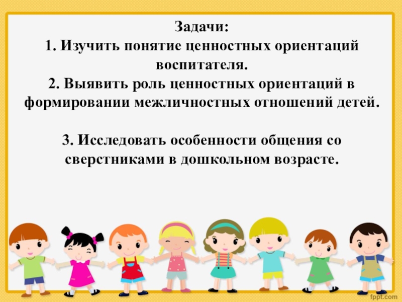 Слайд 4Цель: исследовать влияние ценностных ориентаций воспитателя на особенности взаимоотношений детей в