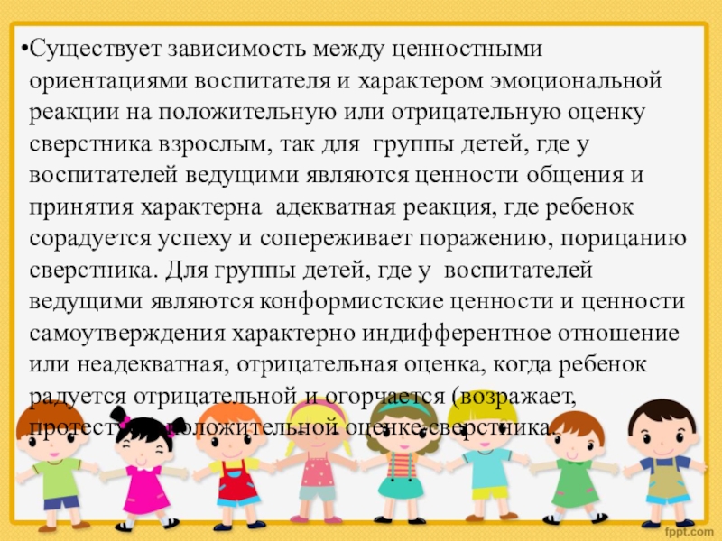 положительную или отрицательную оценку сверстника взрослым, так для группы детей, где у воспитателей ведущими являются ценности общения и принятия характерна адекватная реакция, где ребенок сорадуется успеху и сопереживает поражению, порицанию сверстника. Для группы детей, где у воспитателей ведущими являются конформистские ценности и ценности самоутверждения характерно индифферентное отношение или неадекватная, отрицательная оценка, когда ребенок радуется отрицательной и огорчается (возражает, протестует) положительной оценке сверстника.