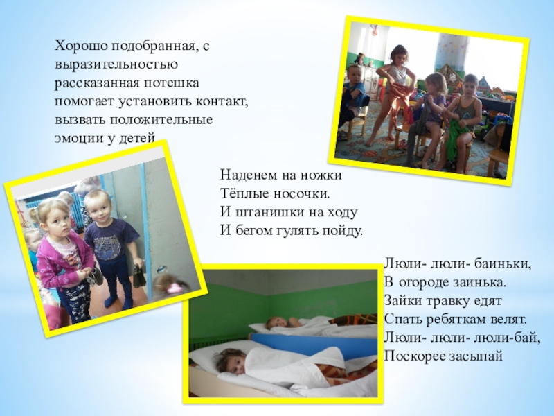 Слайд 11Хорошо подобранная, с выразительностью рассказанная потешка помогает установить контакт, вызвать положительные