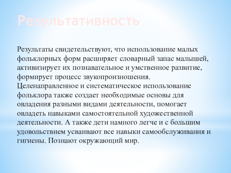 активизирует их познавательное и умственное развитие, формирует процесс звукопроизношения. Целенаправленное и систематическое использование фольклора также создает необходимые основы для овладения разными видами деятельности, помогает овладеть навыками самостоятельной художественной деятельности. А также дети намного легче и с большим удовольствием усваивают все навыки самообслуживания и гигиены. Познают окружающий мир.