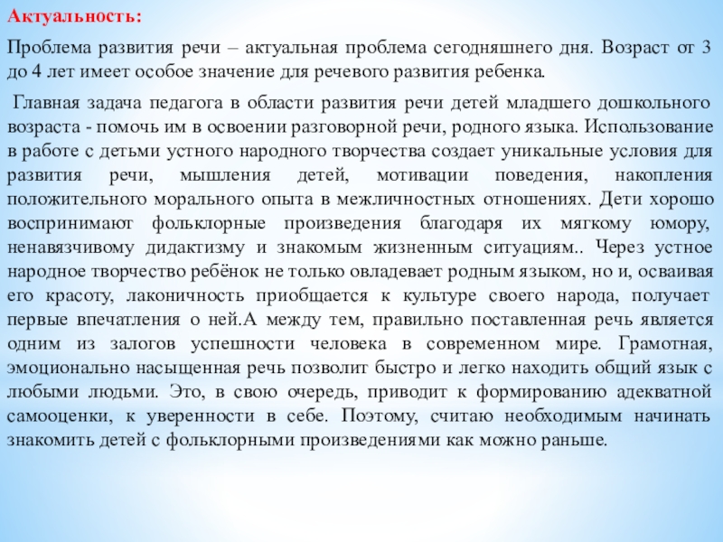 Главная задача педагога в области развития речи детей младшего дошкольного возраста - помочь им в освоении разговорной речи, родного языка. Использование в работе с детьми устного народного творчества создает уникальные условия для развития речи, мышления детей, мотивации поведения, накопления положительного морального опыта в межличностных отношениях. Дети хорошо воспринимают фольклорные произведения благодаря их мягкому юмору, ненавязчивому дидактизму и знакомым жизненным ситуациям.. Через устное народное творчество ребёнок не только овладевает родным языком, но и, осваивая его красоту, лаконичность приобщается к культуре своего народа, получает первые впечатления о ней.А между тем, правильно поставленная речь является одним из залогов успешности человека в современном мире. Грамотная, эмоционально насыщенная речь позволит быстро и легко находить общий язык с любыми людьми. Это, в свою очередь, приводит к формированию адекватной самооценки, к уверенности в себе. Поэтому, считаю необходимым начинать знакомить детей с фольклорными произведениями как можно раньше.