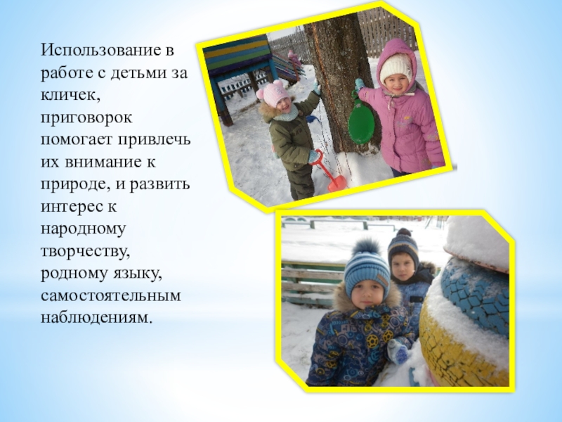 Слайд 6Использование в работе с детьми за кличек, приговорок помогает привлечь их