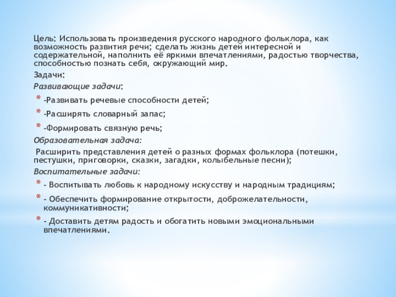Слайд 5Цель: Использовать произведения русского народного фольклора, как возможность развития речи; сделать