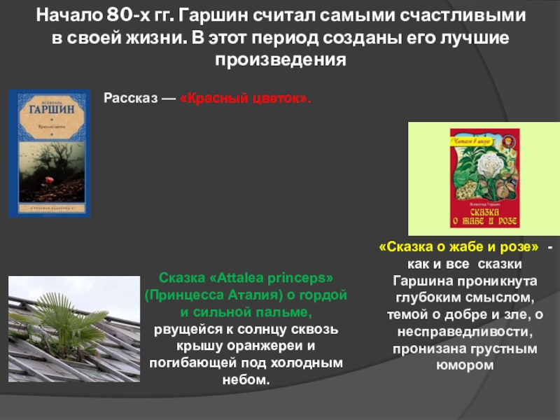 «Сказка о жабе и розе» - как и все сказки Гаршина проникнута глубоким смыслом, темой о добре и зле, о несправедливости, пронизана грустным юмором