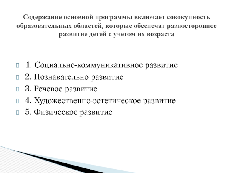 Содержание основной программы включает совокупность образовательных областей, которые обеспечат разностороннее развитие детей с учетом их возраста