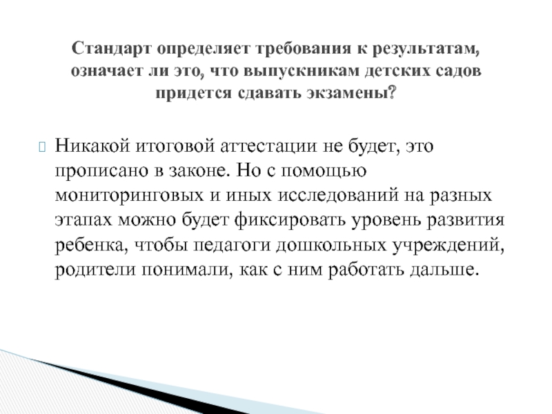 Стандарт определяет требования к результатам, означает ли это, что выпускникам детских садов придется сдавать экзамены?