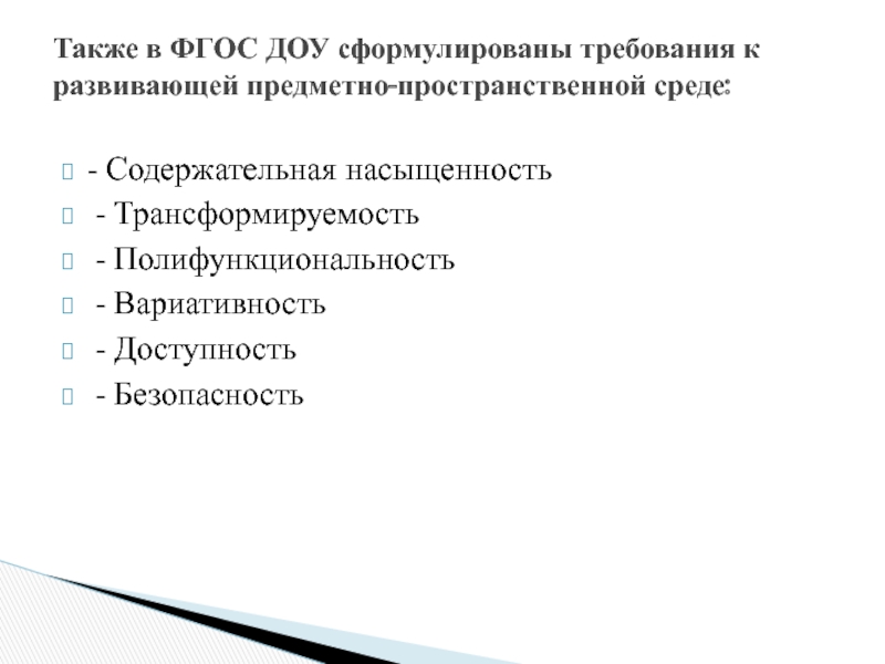 Также в ФГОС ДОУ сформулированы требования к развивающей предметно-пространственной среде: