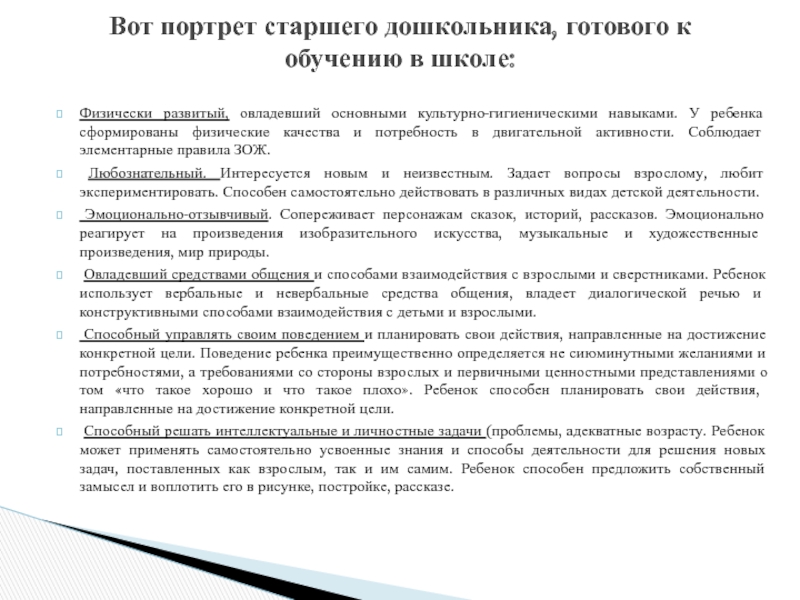 Вот портрет старшего дошкольника, готового к обучению в школе: