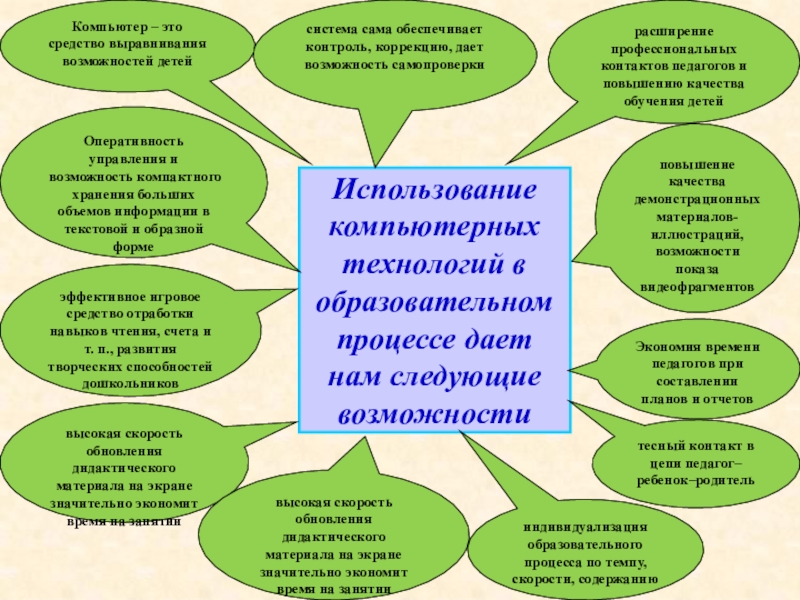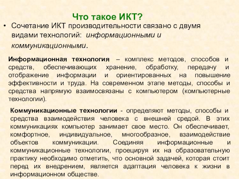 Коммуникационные технологии - определяют методы, способы и средства взаимодействия человека с внешней средой. В этих коммуникациях компьютер занимает свое место. Он обеспечивает, комфортное, индивидуальное, многообразное, взаимодействие объектов коммуникации. Соединяя информационные и коммуникационные технологии, проецируя их на образовательную практику необходимо отметить, что основной задачей, которая стоит перед их внедрением, является адаптация человека к жизни в информационном обществе.