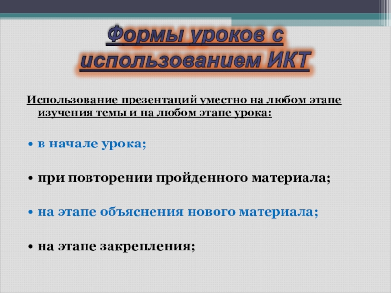 Использование презентаций уместно на любом этапе изучения темы и на любом этапе