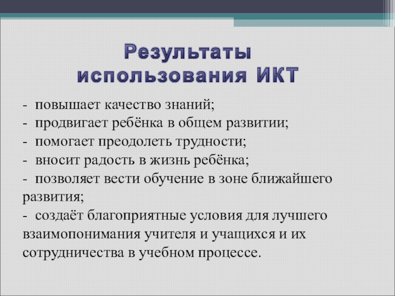 -  повышает качество знаний; -  продвигает ребёнка в общем развитии; -  помогает преодолеть трудности; -  вносит радость