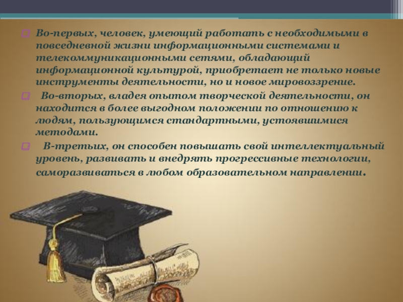 Слайд 5Во-первых, человек, умеющий работать с необходимыми в повседневной жизни информационными системами