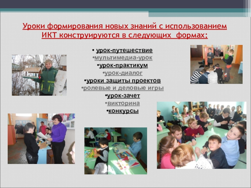 Уроки формирования новых знаний с использованием ИКТ конструируются в следующих формах: урок-путешествиемультимедиа-урокурок-практикумурок-диалогуроки защиты проектовролевые и деловые игрыурок-зачетвикторинаконкурсы