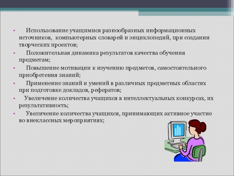 Использование учащимися разнообразных информационных источников, компьютерных словарей и энциклопедий, при создании творческих проектов;