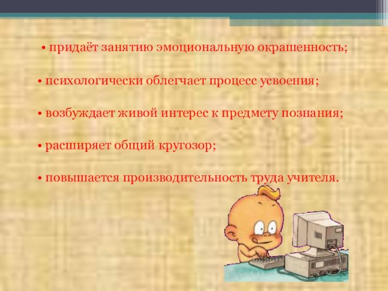 • придаёт занятию эмоциональную окрашенность;  • психологически облегчает процесс усвоения;