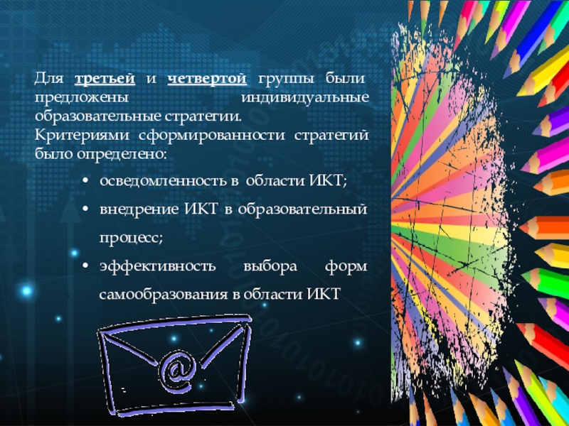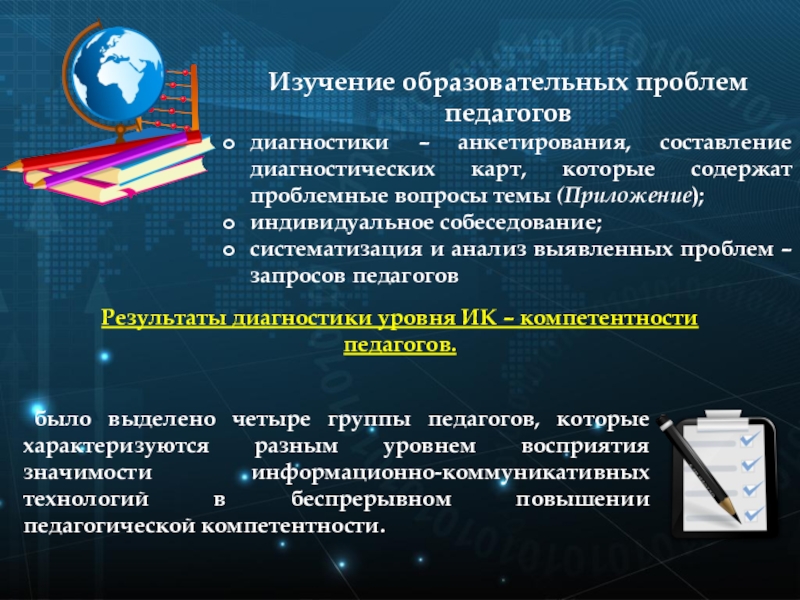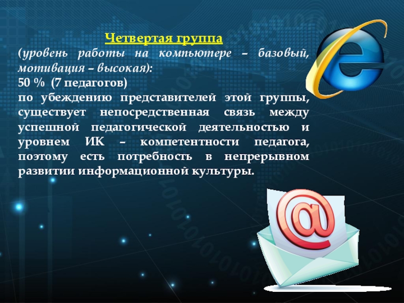 было выделено четыре группы педагогов, которые характеризуются разным уровнем восприятия значимости информационно-коммуникативных технологий в беспрерывном повышении педагогической компетентности.