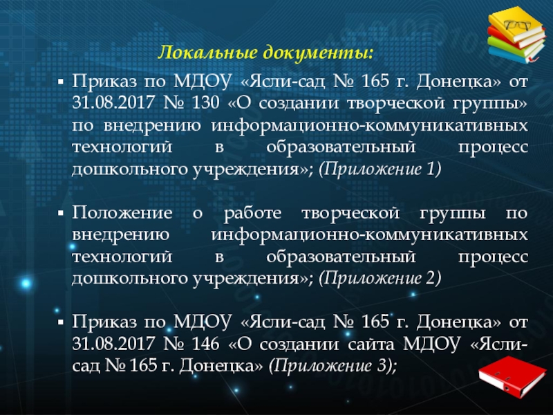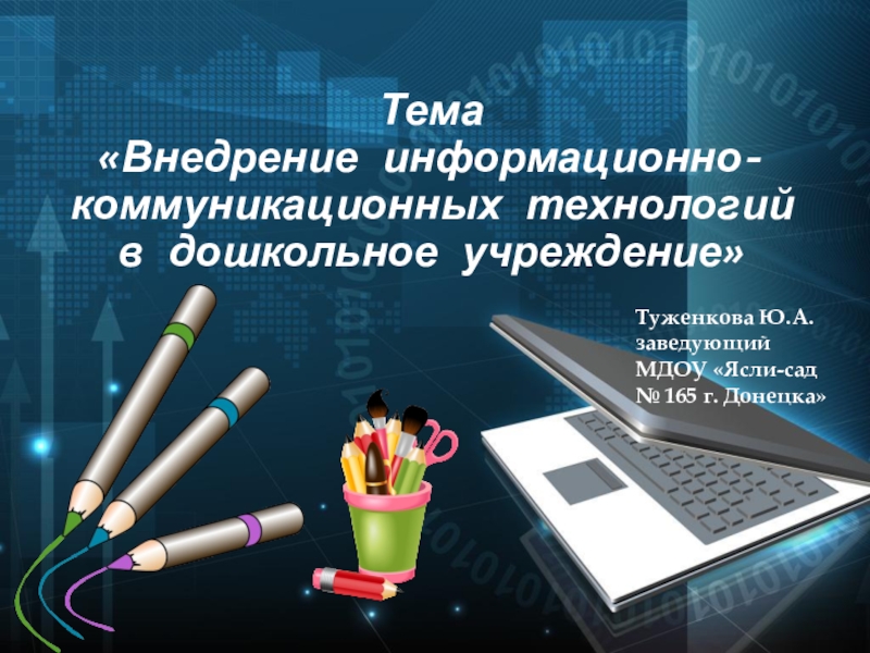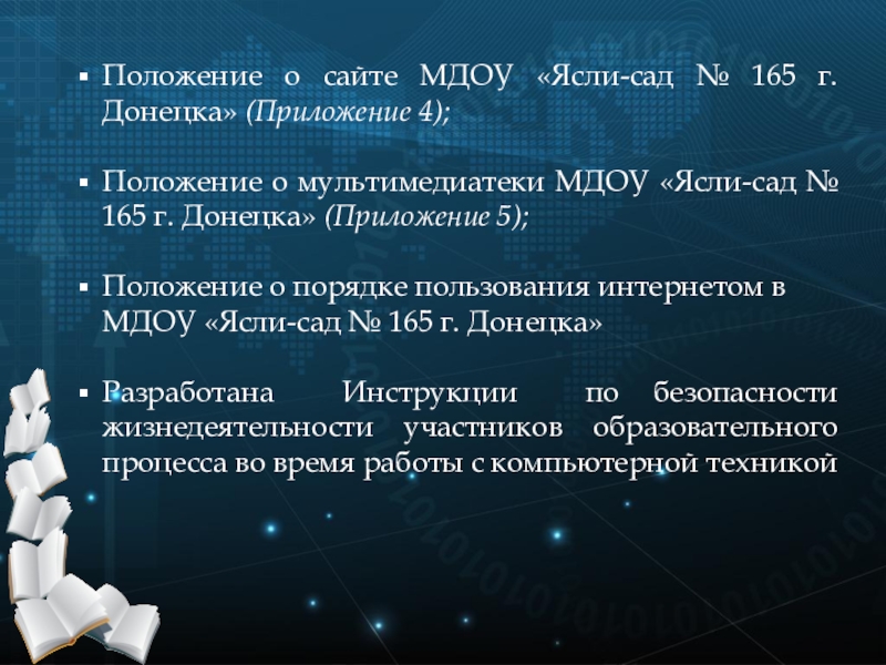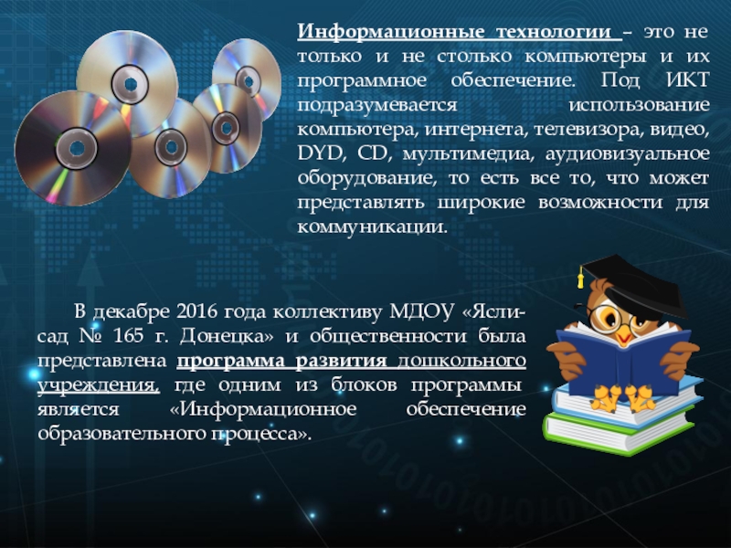 В декабре 2016 года коллективу МДОУ «Ясли-сад № 165 г. Донецка» и общественности была представлена программа развития дошкольного учреждения, где одним из блоков программы является «Информационное обеспечение образовательного процесса».