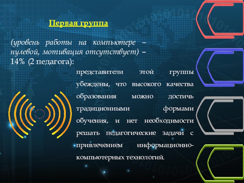 (уровень работы на компьютере – нулевой, мотивация отсутствует) – 14% (2 педагога):