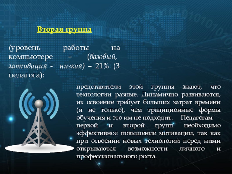 (уровень работы на компьютере – (базовый, мотивация - низкая) – 21% (3 педагога):