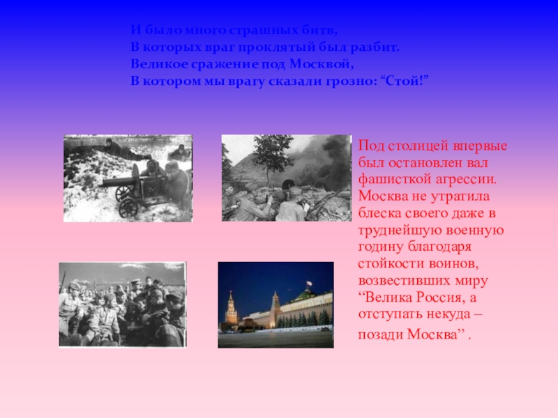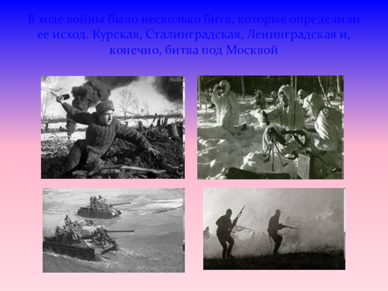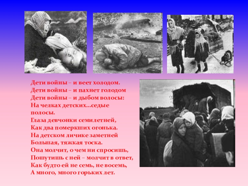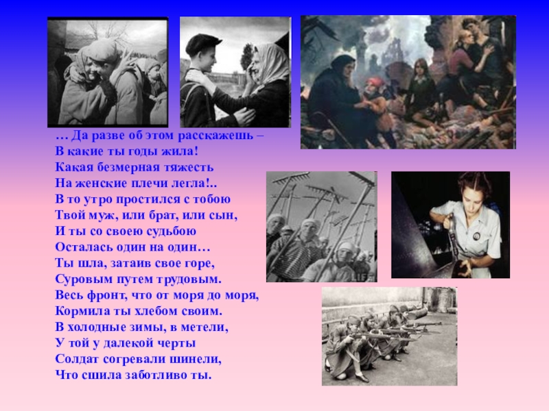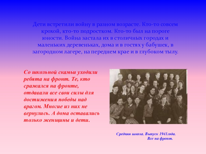 Со школьной скамьи уходили ребята на фронт. Те, кто сражался на фронте, отдавали все свои силы для достижения победы над врагом. Многие из них не вернулись. А дома оставались только женщины и дети.