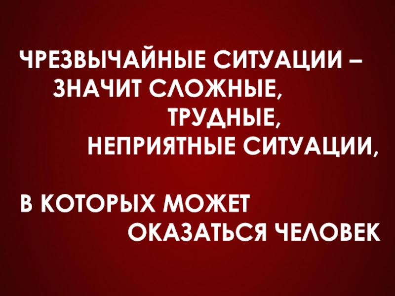 ЧРЕЗВЫЧАЙНЫЕ СИТУАЦИИ – ЗНАЧИТ СЛОЖНЫЕ, ТРУДНЫЕ, НЕПРИЯТНЫЕ СИТУАЦИИ, В КОТОРЫХ МОЖЕТ