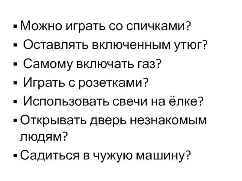 Можно играть со спичками? Оставлять включенным утюг? Самому включать газ? Играть с розетками? Использовать свечи на ёлке?Открывать