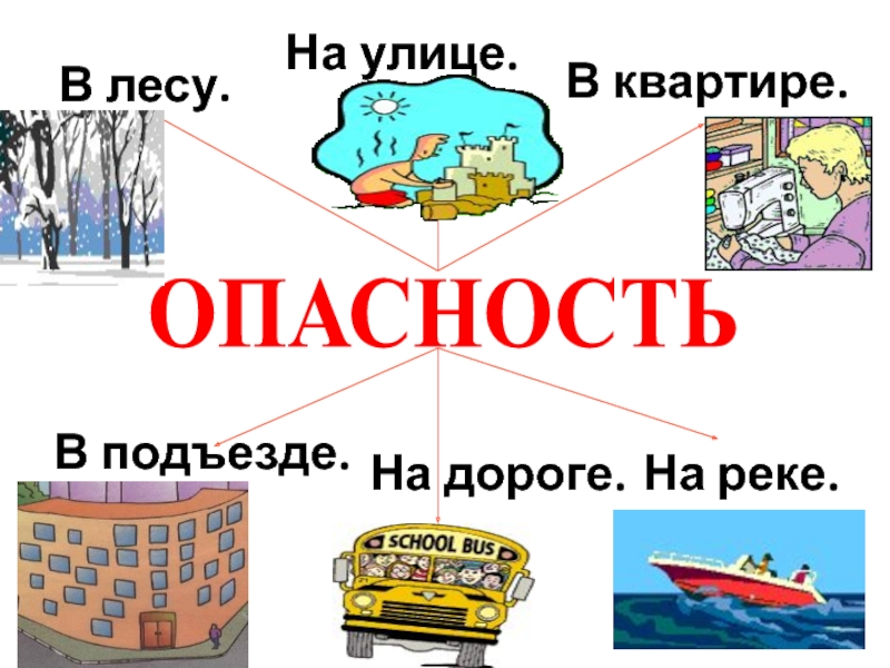 ОПАСНОСТЬВ лесу.На улице.В квартире.В подъезде.На дороге.На реке.
