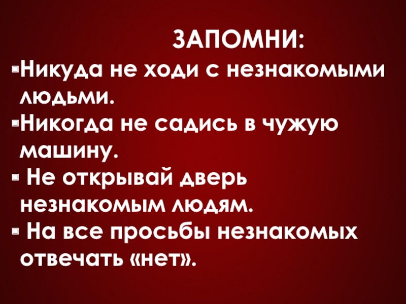 ЗАПОМНИ:Никуда не ходи с незнакомыми людьми.Никогда не садись в чужую машину. Не открывай