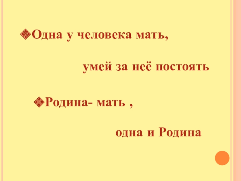 Одна у человека мать, Родина- мать , одна и Родинаумей за неё постоять